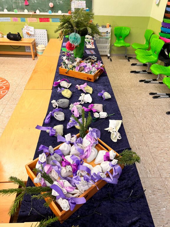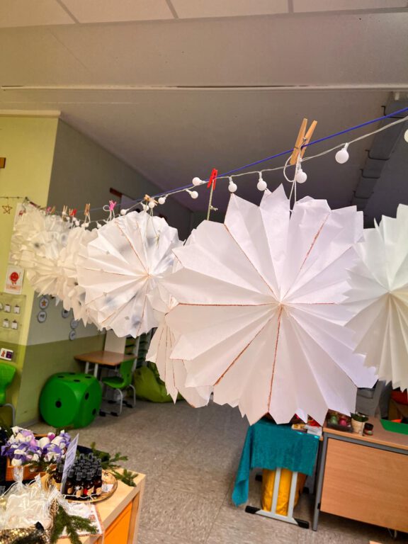Beim Basar selbst verwandelte sich die Schule in eine stimmungsvolle Adventswelt voller Lichter, Düfte und liebevoll gestalteter Verkaufsstände. An zahlreichen Verkaufsständen übernahmen die Kinder stolz die Rolle der Verkäuferinnen und Verkäufer. Ganz nebenbei sammelten sie wertvolle Alltagserfahrungen im Umgang mit Geld – Preise nennen, Wechselgeld berechnen, Waren anpreisen – all das meisterten sie mit beeindruckender Selbstständigkeit und viel Freude.