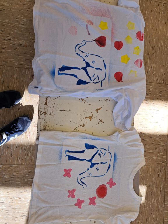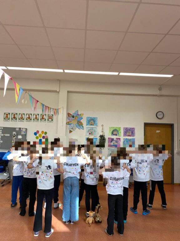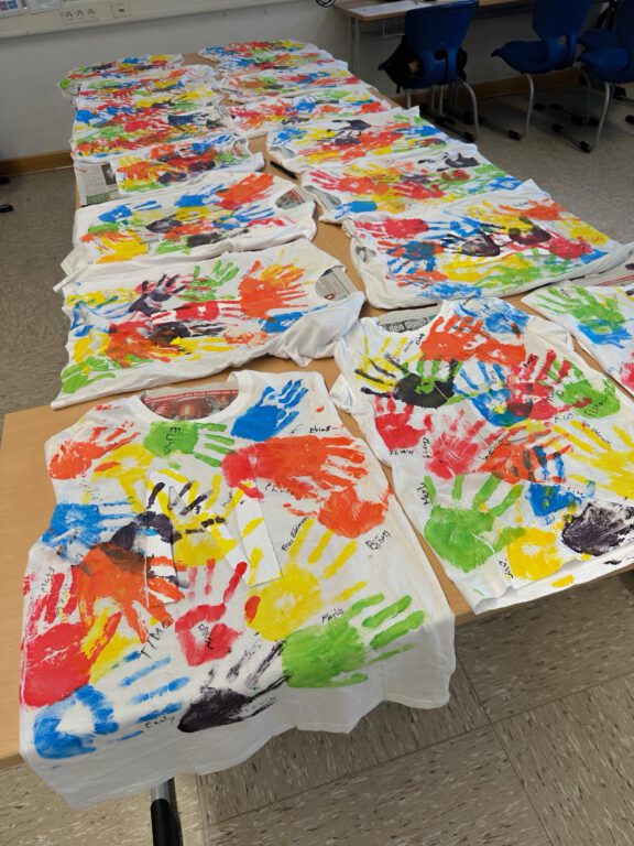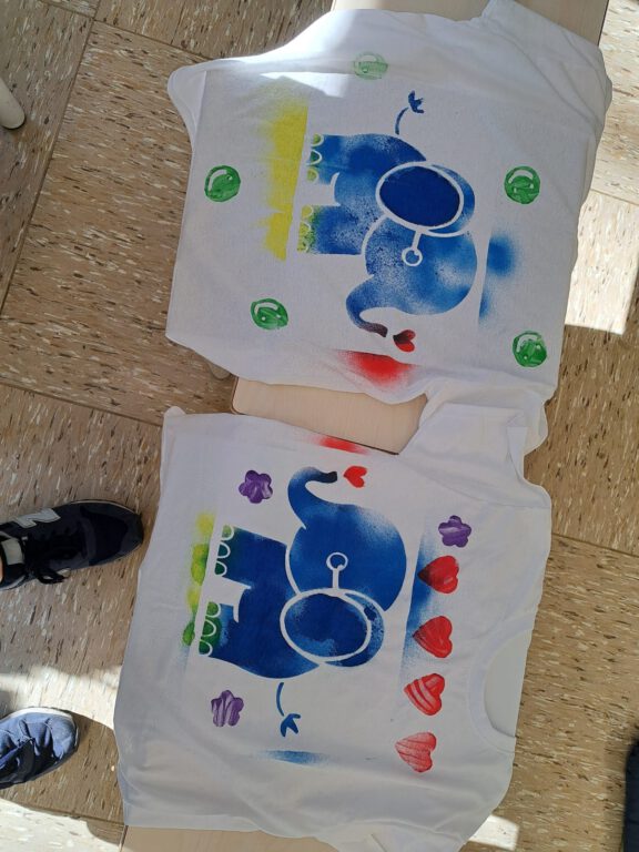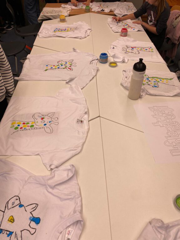 Neben dem Training stand auch die Kreativität im Mittelpunkt. Jede Klasse gestaltete eigene T-Shirts als Erinnerungsstück an die gemeinsame Woche. Die T-Shirts wurden mit viel Farbe, Fantasie und Freude bedruckt, bemalt und besprüht. So entstand für jede Klasse ein individuelles Design.